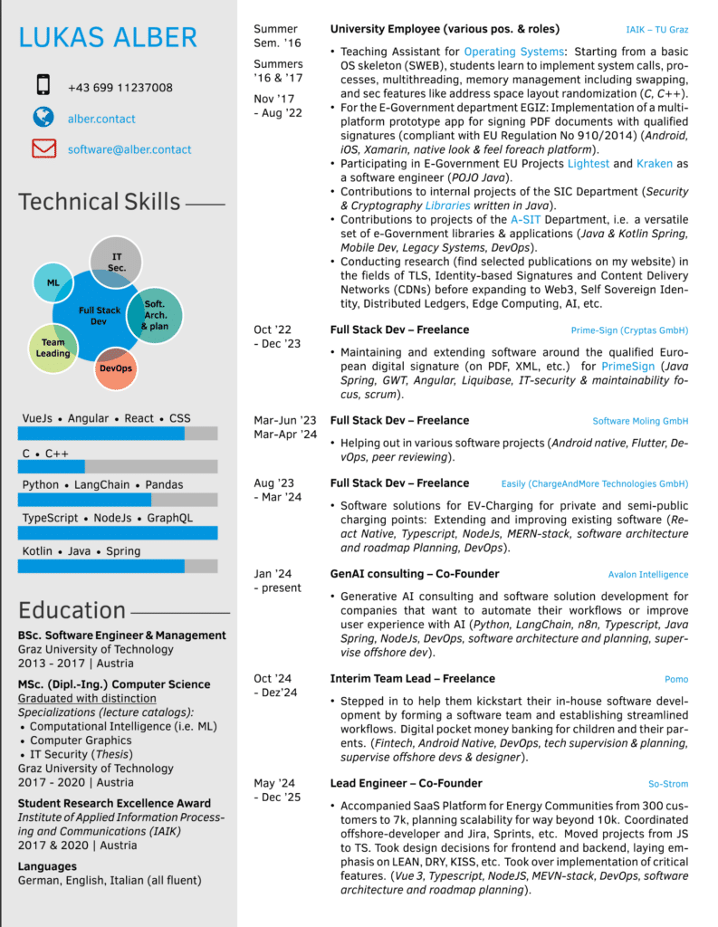 I’m Lukas, a full-stack developer with a preference for backend development. With a background in IT security research at Graz University of Technology, I bring a wealth of expertise and experience to every project. While I have worked with various tech stacks, my favorite remains the Spring Framework. Recently, I helped So-Strom, a SaaS platform for energy communities, from 300 customers to 7k, while planning for scalability way beyond 10k. In recent projects, I was responsible for coordinating offshore-developers, while making architectural decisions and ensuring software quality.